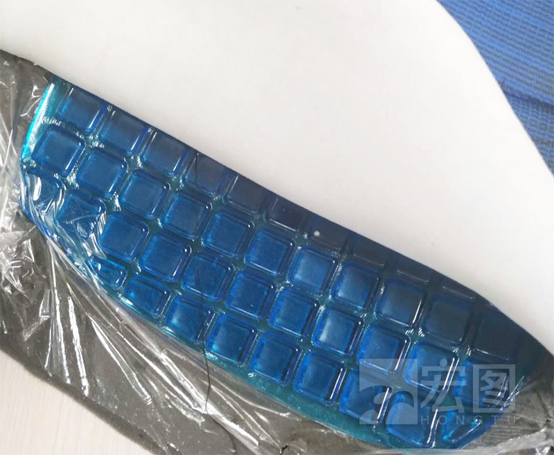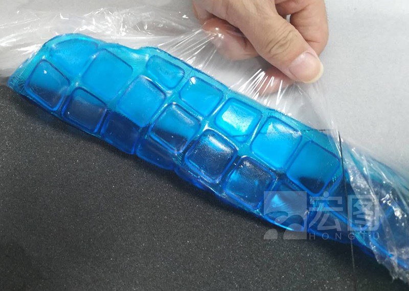 客戶坐墊模具,然后將1:1配比混合攪拌抽真空后液體硅凝膠倒入模具中,讓其加溫或者自然成型,在倒入硅凝膠前需要加入一張薄膜,硅膠硫化后表面也需要加入薄膜防止硅凝膠與海綿或者其他物質(zhì)發(fā)生吸附。硫化后硅凝膠非常柔軟,手感類似果凍。